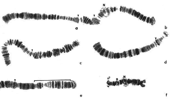 Centromeres indicated by arrowheads. :  : B - Balbiani ring; N - nucleolus