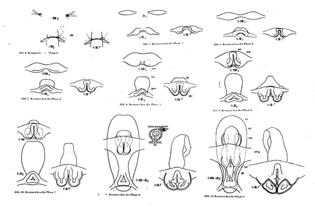 This figure shows the "anlagen" or developing adult structures in the 10th and 11th body segments, divided into nine developmental stages from top left to bottom right. The female structures are on the left, covering both segments, while the male structures, on the right, are only in segment 11.
