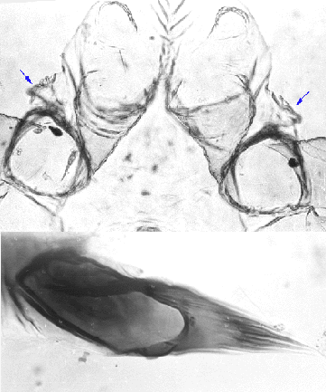 Pupal cephalic tubercles (above) - note the frontal warts (arrowed),and caudolateral spur of segment VIII (below), of C. decorus.