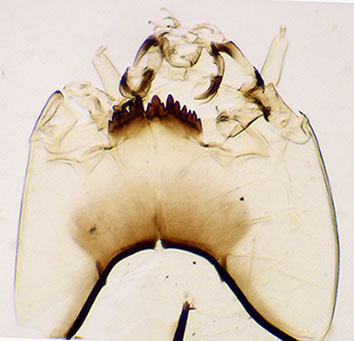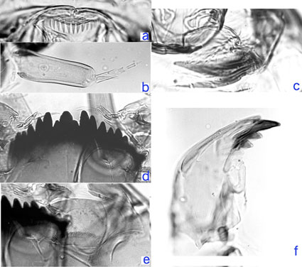 e. Ventromentum with about 40 striae; f. Mandible - note 3rd inner tooth is pale and not fully separated (type IA).