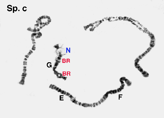 Arm G generally paired with a subterminal nucleolus (N) and two Balbiani rings (BR). [ Return to Index| Return to C. species c ]