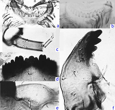 Larval mouthparts of C. hypoboreus.a. and b. Varieties of Pecten epipharyngis development; c. Antenna; d. Mentum with worn teeth, 4th laterals reduced; e. Ventromentum; f. Mandible, again showing signs of wear.
