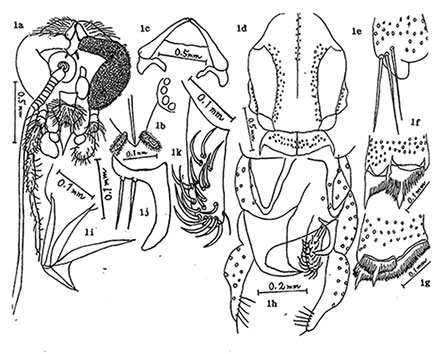 Chironomus tusimaabeus Sasa & Suzuki 1999 Adult ![]() Hypopygium and superior volsella of C. tusimaabeus from Sasa & Suzuki 1999 Body uniformly black or dark brown, abdominal tergites slightly paler along caudal margin. Setae on scutellum and abdomen arising from pale pits. Head: Antenna with 11 flagellar segments, AR 3.96 (3.80-4.11). Frontal tubercles prominent 54 µm long and about 3.5 times longer than wide. Palp 5 segmented, segment I with a seta, other segments with numerous setae; 45 (34-56) clypeal setae. Thoracic setae: 20.7 (16-26) acrostichal; 34.8 (34-36) dorsocentral; 7.3 (7-8) prealar; 39 (37-41) scutellar in two rows. LR1 1.48 (1.43-1.54); LR2 0.59 (0.58-0.62); LR3 0.74 (0.70-0.80); BR 3.8 (3.2-4.4), i.e. short beard. No indication of setae on TIX. Hypopygium with anal point extremely and unusually wide and sickle-shaped in lateral view; Superior vosella possibly E-type (h) of Strenzke (1959); Inferior Volsella reaching about to tip of anal point and a third along the gonostylus, with 18 simple recurved setae. Gonostylus moderately swollen and sharply constricted over distal third and with 6 setae at distal end. Female, pupa, larva and cytology unknown. Found: Type locality - Kechi Dam, Mitsushima, and Nita Dam, Kamiagata, both Tsushima Island, Nagasaki Prefecture, Kyushu, Japan. [Holotype: male, 355:018 (NSMT-I-Dip 5166); paratypes: males, No. 355:95, 374:57]. |