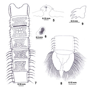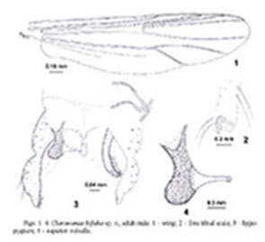 Chironomus (Lobochironomus) bifidus (Pal & Hazra 2017) Pupal characters indicate that this is not Chironomus Adults Total length 4.38-5.69 mm; wing length 2.68-2.9 mm; total length/wing length 1.66-2.12; wing length/length of profemur 2.22-2.28. Coloration. Thorax brown. Abdomen brown with few setae. Wing transparent. Head. Eyes bare, with 65-73 µm long dorsomedian parallel-sided extension. Temporal setae 11-14 (IV 2-4, OV 2-3, Po 3-4). Frontal tubercles present. Clypeus with 11-16 setae on each side. Tentorium (?-this is a larval character) 100-166 µm long and 3-42 µm wide at sieve plate. AR 3.75-4.5; ultimate flagellomere 1056-1220 µm long; total antennal length 1300-1545 µm. Length ratio of palpomeres (I-V) (µm): 81-130, 81-114, 81-114, 97-114, 49-81. CA 0.51-O.55, CP 1.61-2.04.(was P5 shrivelled in these specimens?) Thorax. Acrostichals 10-12; antepronotals 6-10. dorsocentrals 5-6 setae; prealars 4-7; scutellum 8-10 setae. Wing (Fig. 1) transparent without any markings, anal lobe indistinct. 2 Scf on brachiolum, 15-17 setae on squamal fringe; VR 1.06-1.16. Leg lengths and proportions: ![]() ![]() C. bifidus adult male characters Female - not known. Pupa: Total length of exuviae 6.8 mm, antennal sheath 1.78 mm. wingsheath 1.77 mm. Color light brown; dark brown margin at wing sheath, margin of tergites. Frontal apotome 405 µm long and 324 µm wide, without a frontal wart; Cephalic tubules not prominent, with an apical seta 8 µm long. Basal ring kidney shaped, 113 x 82 µm.Tergites I, VII and VIII bare, II-VI with uniform shagreen. Hookrow of TII with about 54-56 hooklets, occupying 0.75 of segment width. Pedes spurii A and B present. Caudolateral comb of segment VIII with 3-4 stronger spines. ![]() C. bifidus pupal characters Larva: Damaged during preparation but apparently no recording of gross morphology before treatment for slide mounting. Found: India - Type locality: Malda, Gour, West Bengal (24.90°N. 88.11°E). |