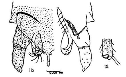 Chironomus brevistylus Guha et al. 1985.Adult: Body length 4.73 mm, wing length 2.1 mm), wing width 0.57 mm. Antenna missing. Head yellow; vertex with 11 setae; 20 clypeal setae, clypeal ratio 1.2. Maxillary palp brown, ratio of segments: 10 : 11 : 40 ; 50 : 64; P5/P4 1.28; P5/P3 1.63. Frontal tubercles well developed. CA 0.68, CP 1.15. Frontal tubercles well developed, about twice as long as wide. Lateral pronotal setae absent. Thorax yellow, antepronotum collar-like without v-shaped emargination; postnotum yellow and bare. Setae: 2 Acrostichal; 9 Dorsocentral; 4 Prealar; 10 Scutellar. Wing: 2 Scf on brachiolum, 13 setae in squamal fringe. Dark spot on fCu. CR 0.97, VR 1.05. Femur and tibia of all legs yellow, tarsomeres of fore and hind legs missing from type, TI-III of midleg with apical brown band, rest brown, LR1 2.1; LR2 0.68; LR3 0.64. Ta4 of anterior legs noted as unusually long (from paratypes). Abdomen yellow and terga uniformly setaceous. Anal point slender with apex blunt. Gonocoxite with 16-18 setae; gonostylus short and stout, coming to a narrow point (hence name). Superior volsella closest to E-type of Strenzke (1959); Inferior volsella short and wide, extending barely past the base ot the anal point and the gonostylus, shown with simple setae. Ground color of scutum yellow, scutal stripes reddish brown, scutellum yellow, postnotum dark brown, halteres yellow; wings unmarked, r-m dark brown. In all legs, femur and tibia are entirely yellow, tarsi I, II and III largely yellow and each with an apical dark ring, tarsi IV and V largely dark brown; ground color of abdominal tergites greenish yellow, tergites I to VII each with a large central dark patch which is almost triangular in tergites II to IV (Fig. below); tergites VIII and hypopygium dark brown. Hypopygium (see Fig. 1, below). Ninth tergite with 12-16 long setae in the middle. Anal point slender and slightly expanded apically. Superior Volsella (Fig. I below) composed of a relatively high, triangular base bearing several long setae, and a hook-like apical process. Inferior Volsella (Fig. 1, below) relatively short, stout and almost parallel-sided, with 14 long and recurved setae arising from apical 1/5. Gonostylus abruptly narrowed at about apical 1/3. ![]() From Guha et al. 1985. Body length 4.07 mm, wing length 2.07 mm, width 0.66 mm. Femur and tibia brown, TI-III with brown aical band, rest of all legs brown. Antenna pale, seg. V longest and brown, ratio of flagellomeres I-V 9 : 7 : 7 : 8 : 12. AR 0.26; A5/A1 1.33. Genitalia: Notum 0.15 mm. Coxosternapodeme incurved. Gonapophysis VIII divided into a broad posteriorly directed dorsomesal lobe, hooked ventral lobe and needle-like apodeme lobe. Gonocoxite IX with 4 setae on each side. Postgenital plate protruded and pointed at apex. Seminal capsules oval, measuring 0.06 mm by 0.039 mm, ducts bent and open separately. Allotypes: 9, data as holotype, paratypes 2 males, 2 females, collected same locality. |