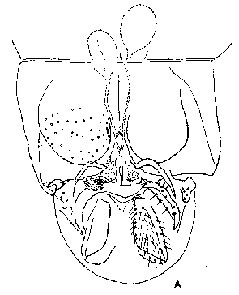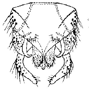 Male hypopygium of C. utterpradeshensis (Madeshwari, 1989)Female: ![]() Female genitalia of C. utterpradeshensis (Madeshwari, 1989) Genitalia as in figure. GCIX with 2-3 setae; segment X with 11-12 setae. Pupa: Body length 5.00-5.40 mm; abdomen pale brown. Respiratory organ with four branches; anterior trunk larger than posterior trunk. TII (not TIII as stated) with a row of hooklets (not counted), spur of segment VIII with two pointed spines. Fourth instar larva: length 9.00-9.84 mm; VT present, but no details; head capsule with a pair of dorsolateral stripes originating from the median strip; length 0.57 mm and width 0.46 mm. Pecten epipharyngis with single row of teeth, figure shows 11 teeth of type B.Mentum shown as type I-II, but 4th lateral very closely attached to 5th laterals and separated from 6th laterals, central tooth appears to be type IIA. Antenna: RO in basal half of A1, 25 &181;m up from base; antennal blade reaching apex of A4; A3 smaller than A4, A5 smallest, AR 1.83. Mandible triangular, appears 4th inner tooth about type I; pecten mandibularis well developed; . Premandible with teeth about equal in length, inner tooth shown about 4x wider. Cytology: not known. Found: Type locality - Khanari Agricultural Farm, Agra, Uttar Pradesh. |