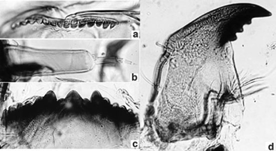 c. Mentum; d. Mandible (Note dark 3rd inner tooth).