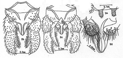 Chironomus mongolbeceus Sasa & Suzuki 1997 as Camptochironomus.AdultWing length 4.46 mm., width 0.28; VR 1.06 (or 0.94). AR 4.28. LR 1.28; BR 1.4; mLR 0.50; hLR0.59. Pulvilli large and brush-like. ![]() Frontal tubercles and male hypopygium of Chironomus mongolbeceus. (Sasa & Suzuki, 1997) Posterior lobe of TIX is as long as the anal point, apparently no central patch of setae. Anal point flanked by a V-shaped lobe reaching just to the end of the anal point; Gonostylus and Inferior Volsella similar to those of Camptochironomus, but the Superior Volsella is quite different, constricted at the base then expanded to a broad trianular lobe bearing numerous long setae and microtrichia. Pupa, Larva and Cytology: Not known Found: Mongolia - (Type locality) Bogd. |
