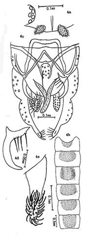 Chironomus mongoldecus Sasa & Suzuki 1997AdultBody length 8.52 (7.28-11.12) mm; wing length 3.86 (3.38-4.81) mm, both highly variable; WW/WL 0.28 (0.27-0.29), R-M area dark; AR 4.35 (3.98-4.75); VR 1.05 (1.03-1.07) or 0.95 (0.93-0.97). Frontal tubules prominent, 38 x 11 µm, i.e. twice as long as wide. Eyes bare, ER 0.23 (0.13-0.29); palp relatively short. Ground color of scutum and scutellum yellow, stripes brown, postnotum dark brown, leg segments almost uniformly yellowish-brown. Abdominal tergites II-VIII each with a large central brown oval area with yellow zones along the lateral and posterior margins (Fig. 4b). Frontal tubules widest at about middle and spindle-shaped, 22 x 12 µm. ER of eyes 0.09-0.29. AR 4.08 (3.48-5.00). Wings bare, membrane slightly bluish, crossvein darkly pigmented, VR 1.03 (1.01-1.034). Thoracic setae: 22.5 (17-28) acrostichal; 34.6 (26-51) dorsocentral; 7.1 (6-8) prealar; 33.3 (18-46) scutellar, all highly variable. Leg ratios: fLR 1.44 (1.32-1.49); mLR 0.60 (0.56-0.62); hLR 0.74 (0.70-0.77); BR highly variable 3.1 (1.9-5.0) (i.e. only some specimens have a tarsal beard). Superior Volsella of the E-type of Strenzke (1959); anal point stout, widest at base; Inferior Volsella long, straight, widest at base and tapering towards rounded apex; gonostylus moderately swollen and narrowing markedly over posterior third. ![]() Frontal tubercles and terminalia of C. mongoldecus from Sasa and Suzuki (1997) TIX shown with 9 medial setae, apparently in a single pale spot. Superior volsella long, darkly pigmented closest of the E(g)-type of Strenzke (1959) Pupa, Larva and Cytology: Not known. Found: Mongolia - (Type locality) Karakorum. |